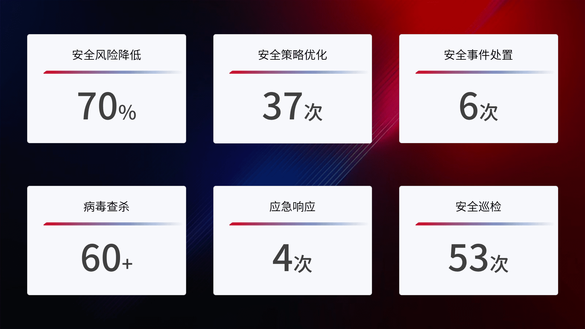 提供全面的安全事件报告体系,,,包括处置报告、、、周报、、、季度和年度总结,,结合持续监控,,,,帮助客户深入了解网络安全状况。。